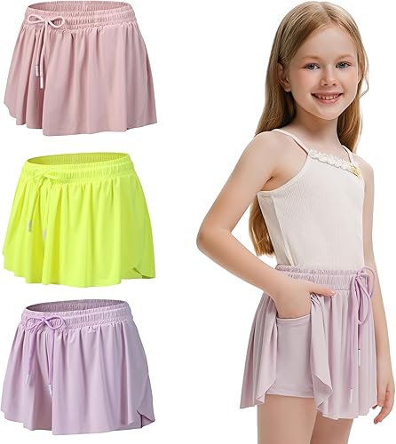 3 Pack Girls Flowy Shorts with Spandex Liner 2 in 1 Youth Junior Butterfly Skirts for Fitness Running Sports