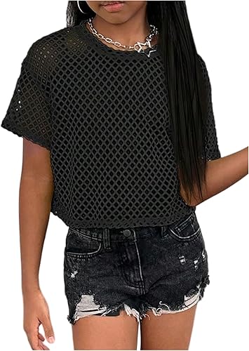 SweatyRocks Girl's Sheer Mesh Fishnet Workout Top Hollow Out Short Sleeve Sports T Shirt