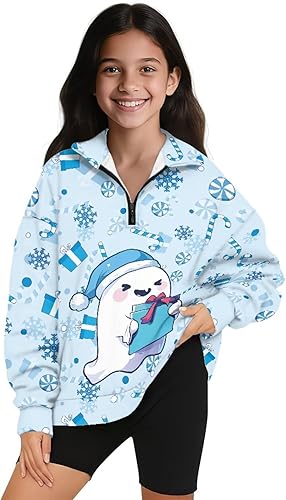 Xoenoiee Girls Half Zip Sweatshirt Long Sleeve Pullover Tops Oversized 3D Graphic Sweater Kids Fall Winter Clothes 5-14Y
