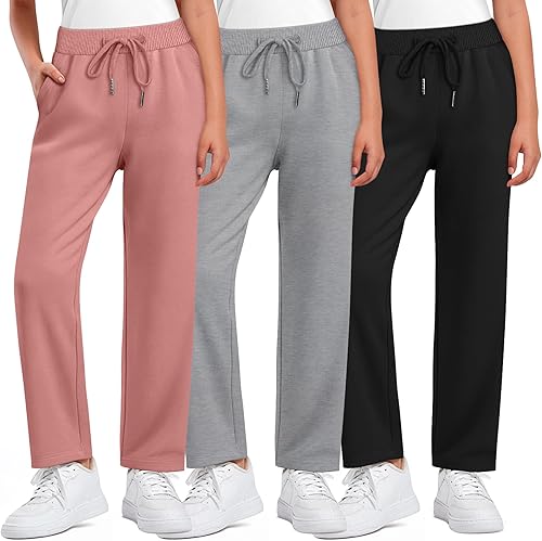 3 Pack Girls Sweatpants Straight Leg Ribbed Waist Active Joggers Teens Athletic Pants with Drawstring and Pockets