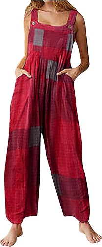Overalls Women, Adjustable Straps Bib Wide Leg Outfits with Pockets Cotton Linen Wide Leg Baggy Jumpsuit