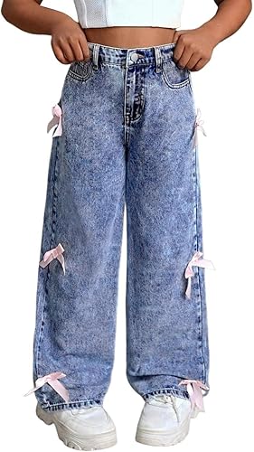 Girls Bow Wide Leg Baggy Denim Pants,Teen Casual Cute Wide Leg Jeans,Kids High Waisted Washed Jean Straight Leg Trouser (US, Alpha, Medium, Regular, Medium Blue)