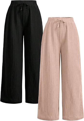 Girl's Linen Pants Elastic Waist Wide Leg Pants Beach Vacation Outfits Palazzo Trousers 2 Packs