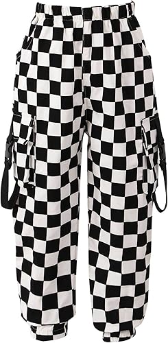 Kids Girls Stylish Plaid Print Cargo Jogger Pants Hip Hop Jazz Dance Trousers Casual Sport Activewear Streetwear