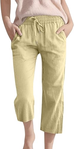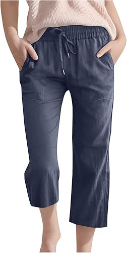 Girls Ladies 3/4 Length Trousers Linen Pants Cropped Casual Trouser with Pockets Kids Girls Summer Jogging Pants