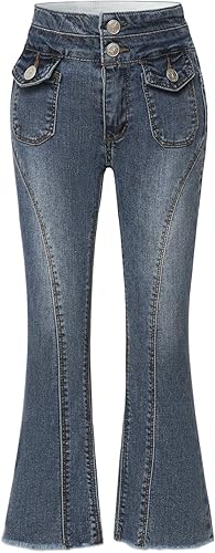 Girls'Bell-Bottoms Jeans High Waisted Pants Double Buttons Frayed Edges Foot Multiple Pockets Flare Pants Fashionable Style