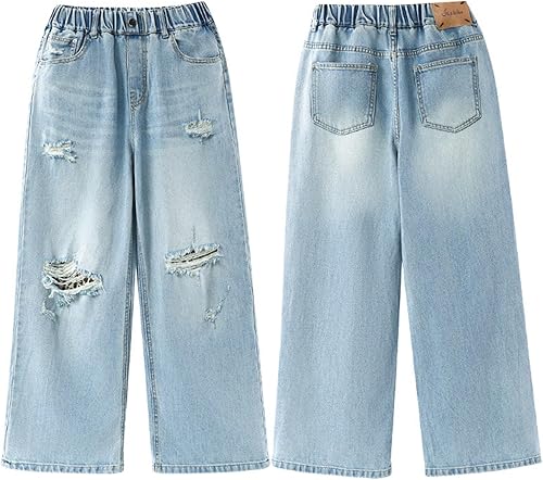 Ripped Jeans for Teen Girls Wide Leg Trendy High Waisted Distressed Baggy Denim Pants Trousers Streetwear 5-14Years