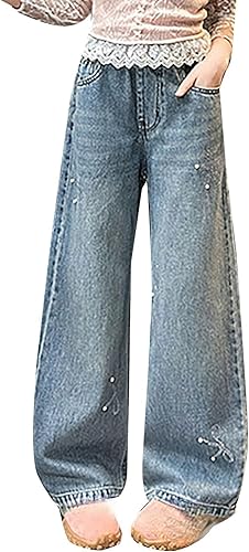 Tween Girl Baggy Jeans Pants Fashion Distressed Wide Leg Elastic Waist Straight Leg Denim Jeans Pants Joggers 5-13 Years