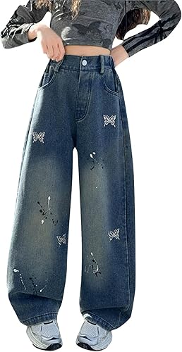 Girls Straight Jeans Kids Butterfly Denim Cargo Pants Distressed Elastic Waist Wide Leg Trousers Streetwear 5-16 Years
