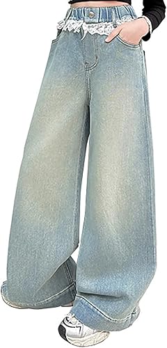Girls Straight Denim Pants Kids Lace Elastic Waist Loose Y2K Jeans Long Trousers Casual Y2K Pants for 5-16 Years