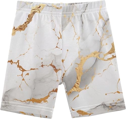 Girls Cotton Bike Shorts Gold White Marble Print Toddler Athletic Dance Cartwheel Summer Clothes, 4T
