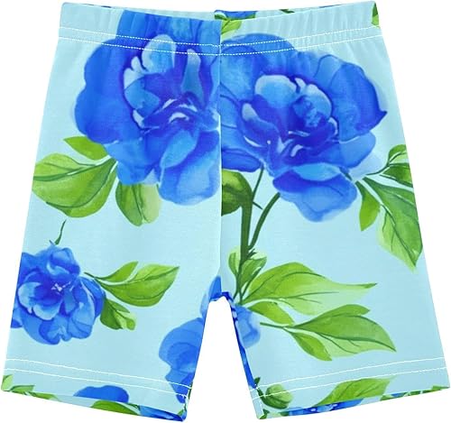 Girls Cotton Bike Shorts Blue Flowers Green Leaves Toddler Athletic Shorts Summer Outfits, 4T