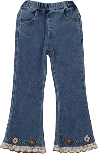 Girls Denim Bell Bottoms Jeans Ruffled Lace Flower Design Denim Pants Kids Wide Leg High Elastic Waist Jeans