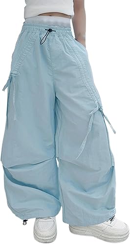 Kids Girls Loose Wide Leg Pants Baggy Elastic Waist Solid Color Pleated Casual Pants Lightweight Comfy Trousers Pockets
