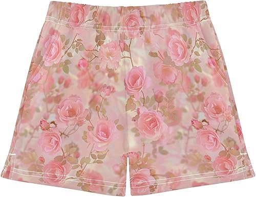 Girls Shorts Summer Pink Rose Little Flower Athletic Shorts with Stretchy Elastic Waist Beach Shorts XS-XL