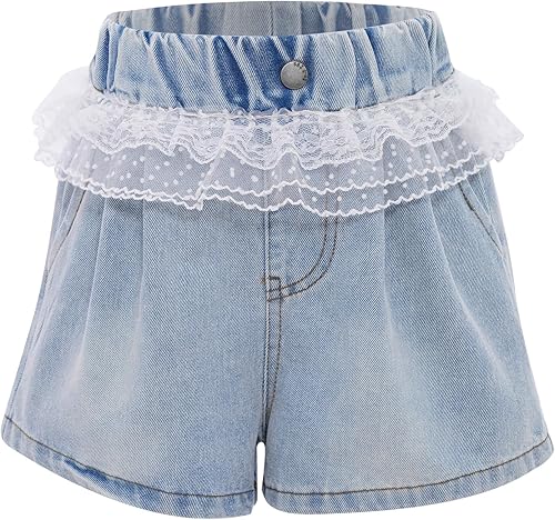 FEESHOW Kids Girls Lace Ruffles Shorts Jeans Casual Baggy Elastic Waist Denim Shorts Loose Summer Bottoms for 5-15 Years