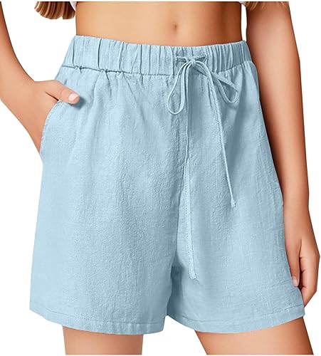 Teen Girls Cotton Linen Shorts Summer Solid Elastic High Waist Casual Short Pants Kids Loose Fit Beach Resort Shorts