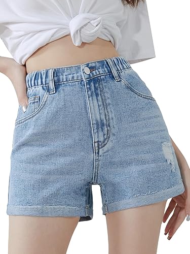 Verdusa Girl's Roll Up Hem Elastic Waist Ripped Denim Shorts Cuffed Jean Shorts