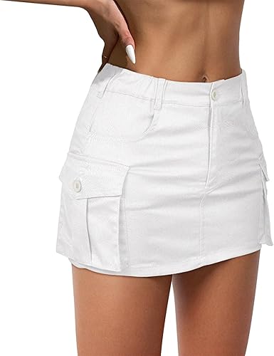 Zando Low Waist Cargo Skirt for Women Girls Vintage Mini Skirt Y2k Jean Skort Low Rise Short Denim Skirt with Pockets White M