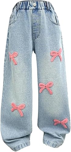 Baggy Jeans for Girls Bow Wide Leg Elastic High Waisted Kids Casual Y2K Pockets Denim Pants