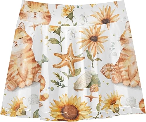 Cartoon Cats Sunflowers Seastars White Tennis Skirts for Girls with Built-in Shorts Flowy Pleated Skirt for Kids 3-4T