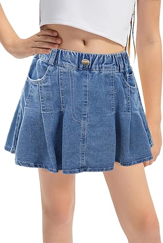 Girl’s Pleated Denim Skirt Elastic Waist A Line Mini Short Skirt with Pockets Ruffle Hem Jean Skirt 5-14 Years