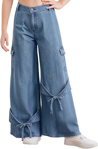 Kids Girls Wide Leg Cargo Jeans Cute Bowknots Y2k Vintage Baggy Denim Pants with Flap