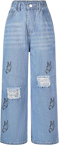 Jeans for Girls Baggy Wide Leg Cute Star Butterfly Embroidery High Elastic Waisted Denim Pants Y2K Streetwear 3-16Y