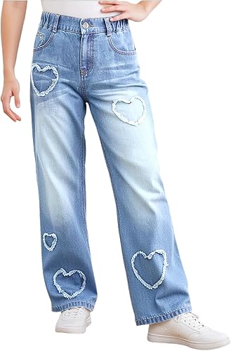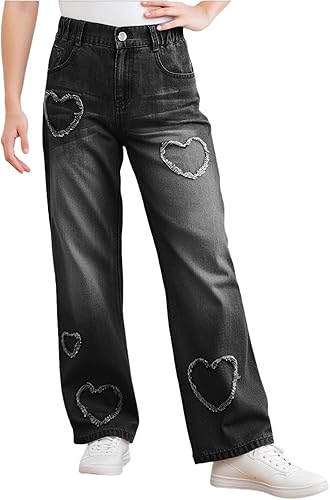 easyforever Kids Girls Jeans Y2K Heart Patchwork Wide Straight Leg Trousers Casual School Denim Pants with Pockets