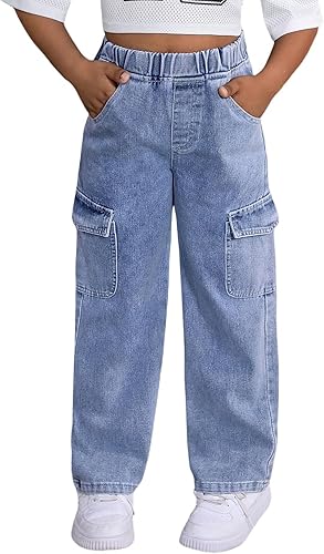 Girls Loose Wide Leg Jeans Stretch Elastic Waist Comfy Streetwear Denim Pants with Pockets for 5-15 Years