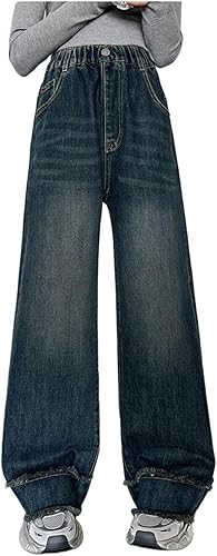 Anjikang Wide Leg Jeans for Girls Casual Baggy Straight Leg Denim Sweatpants Kids Elastic Waist Preppy Jean Pants with Pocket