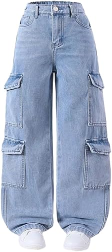 Nivne Tco Tween Girls Cargo Jeans Casual Oversized Multi-Pocket Washed Light Blue Streetwear Denim Pants with Zipper Fly