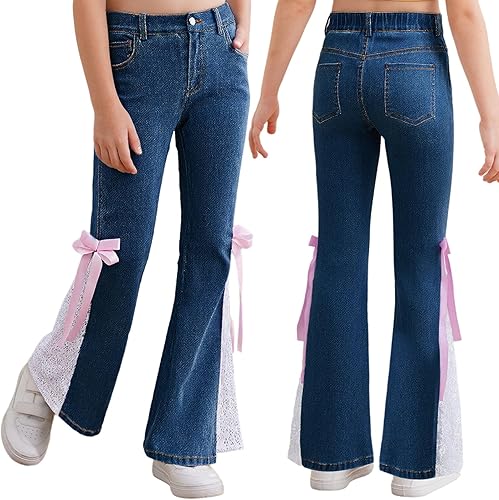YiZYiF Y2K Bell Bottom for Girls Flare Jeans Denim Pants for Birthday Party Trousers Bowknots Lace Patchwork