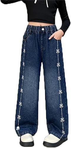 Baggy Straight Jeans for Kids Girls Washed Wide Leg Elastic Waist Denim Pants Youth Girls Loose Casual Trousers