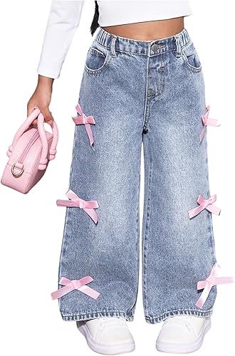 WDIRARA Toddler Girl's Bow Knot Baggy Denim Pants Elastic High Waisted Wide Leg Jeans
