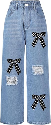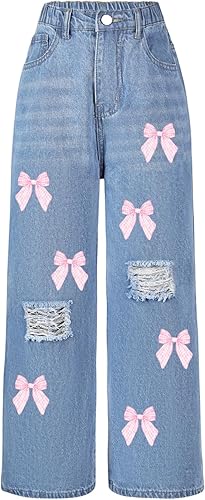 Bow Jeans for Girls Wide Leg,Kids Baggy Flare Denim Pants High Waisted Cute Clothes Y2k Outfits with Pockets