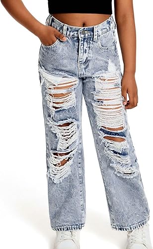 Girl's Distressed Jeans Elastic High Waist Wide Straight Leg Y2k Ripped Baggy Denim Pants Summer Trousers Streetwear 6-13T