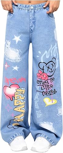 Kids Girls Baggy Jeans Print Star Summer Casual Wide Leg Denim Pants Jeans Trousers