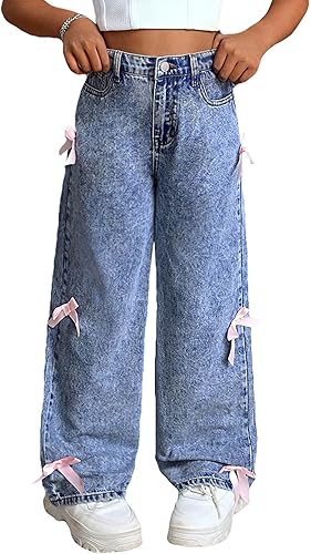 Bow Jeans for Girls Cute Baggy Jeans Wide Leg Denim Pants High Waisted Trousers Kids Y2K Streetwear with Pockets Fall Winter