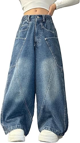 Kids Girls Baggy Straight Jeans Distressed Loose Wide Leg Elastic Waist Denim Pants Vintage Trendy Casual Trousers
