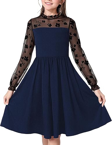 QPANCY Girls Long Sleeve Dresses Casual Round Neck Midi Double Layered Ruffled Hem Dress