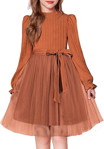 Arshiner Girls Tulle Dress Puff Long Sleeve Mock Neck Cable Knit Sweater Formal Casual Fall Winter Tutu Dresses with Belt