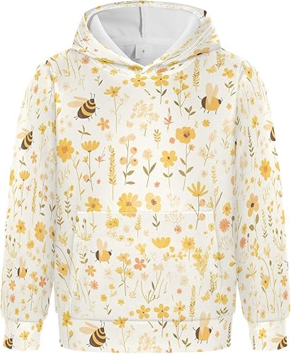 KLL Vintage Embroidery Honey Bee with Wild Flowers Unisex Girls Boys Sweatshirts Sweater Fashion Hoodie Kangaroo Pocket