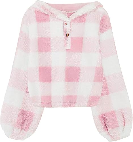 Fuzzy Hoodies for Kids Girls Plaid Warm Button Hooded Pullovers Preppy Oversized Sherpa Fashion Sweatshirts