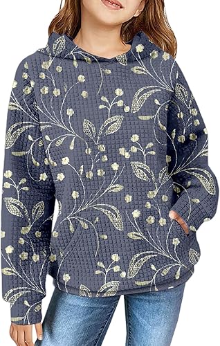 Waffle Hoodie for Girls Long Sleeve Artistic Floral Print Hooded Sweatshirt, Trendy Pullover Daily Outfits for Kids