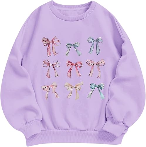 KEEVICI Girls Bow Sweatshirt Cute Graphic Sweatshirts Kids Kawaii Preppy Hoodie Long Sleeves Shirts Cotton Pullover