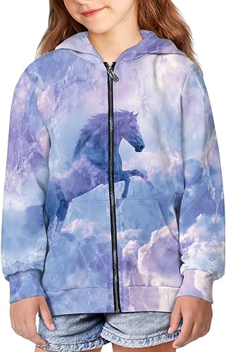 Galaxy Horse Girls Zip Hoodie Soft Long Sleeve Pullover Hooded Sweatshirt Casual Kids Jacket with Pocket for Fall