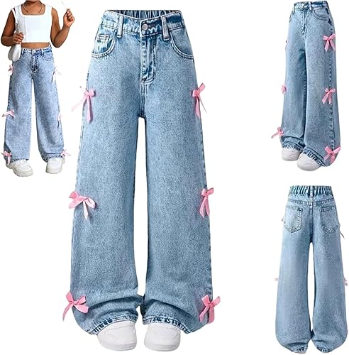 Girls Bow Wide Leg Baggy Denim Pants,Teen Casual Cute Wide Leg Jeans,Kids High Waisted Washed Jean Straight Leg Trouser (US, Alpha, X-Large, Regular, Light Blue)