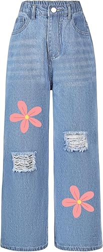 Girl's Ripped Floral Graphic Jeans Elastic Waist Denim Pants Cute Tween Clothes for 8-12