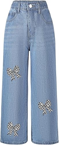 Linjinx Girls Wide Leg Jeans Elastic Waist Denim Pants Bow Baggy Denim Trousers Kids Y2k Streetwear with Pocket